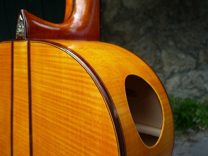 I made this flamenco guitar for a special request from European spruce and flamed maple with an extra light open fan strutting inspired by Santos Hernandez. The sound is fast and percussive but also beautiful, quite different from a contemporary classical guitar.