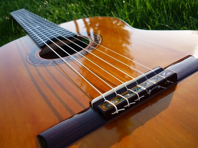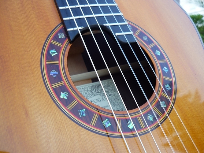 Fully handmade lattice bracing concert classical master guitar with custom inlays made for special request. Western Red Cedar soundboard, Indian Rosewood back&sides, all wooden harmonic lattice bracing, double soundportal, radiused fingerboard, stainless steel frets, 12 hole bridge.