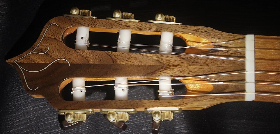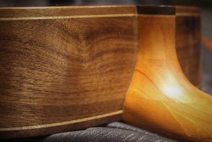 Handmade classical guitar by Australian luthier Joseph Quinn. Swiss moon spruce top with Daniel Friederich style bracing, black walnut back and sides with bunya details, spotted gum bridge and fingerboard, fiji mahogany neck, rubner 18:1 single-style tuners, sterling silver and black walnut inlays. 650 mm scale length, 52mm nut width.