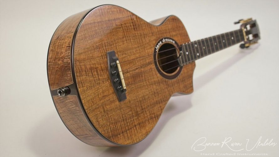 A Baritone Ukulele with slotted headstock using Rubner tuners. Indian Rosewood bindings and rosette. Ebony head plate veneers, bridge and fret board. Scoop cutaway for easy acess to upper frets.