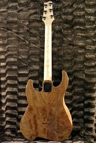 RockBeach CamelBack CB-III Solid Body Electric Guitar. Bookmatched top and back master grade Claro Walnut with AAAAA Birdseye Maple midsection. Tesla Opus1 neck and middle and VR-Extreme bridge pickup with push-push switch for series/parallel configuration selection. 25.5" Scale Flamed/Birdseye Maple neck with Birdseye Maple fingerboard and SS Medium Jumbo frets. Hipshot hardware and Earvana compensating nut.